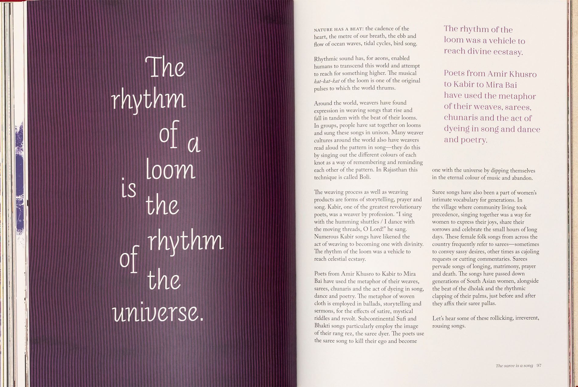 In the gathering and retelling of saree stories, we crafted the book to weave together the historic, mythic and cultural legacy of India’s most enduring icon. Using the saree as a lens, the book collates forgotten songs, weaves, belief systems, textile traditions, iconographies and art movements.