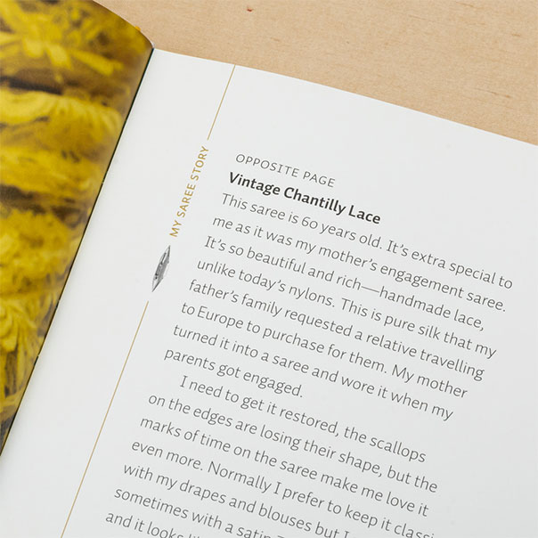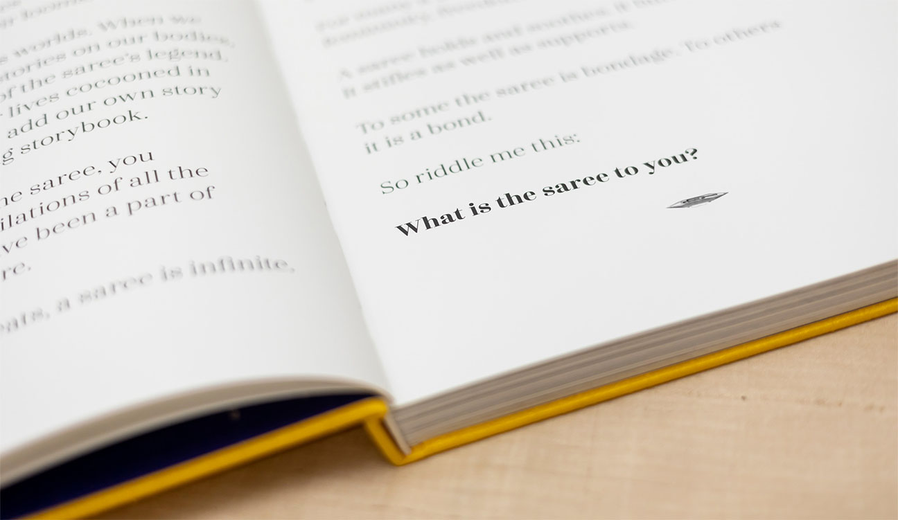 What sets the book apart is that it is not an academic or research tract but built upon the saree memories of women from all walks of life. The book became a repository—an archive of the women's desires, ambitions, emotions, identities and family histories, heirlooms and inheritances. To express this, the creative concept poses the question: What is the saree to you?