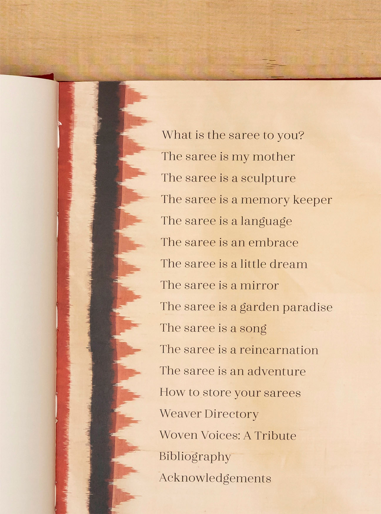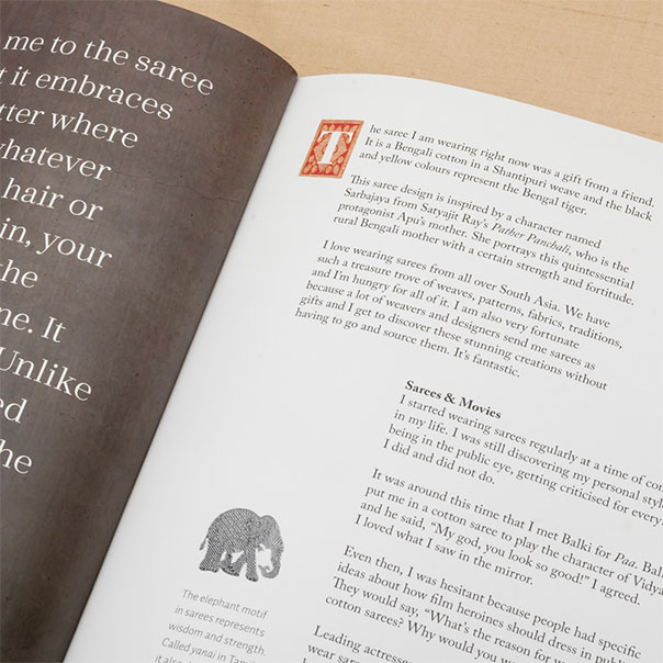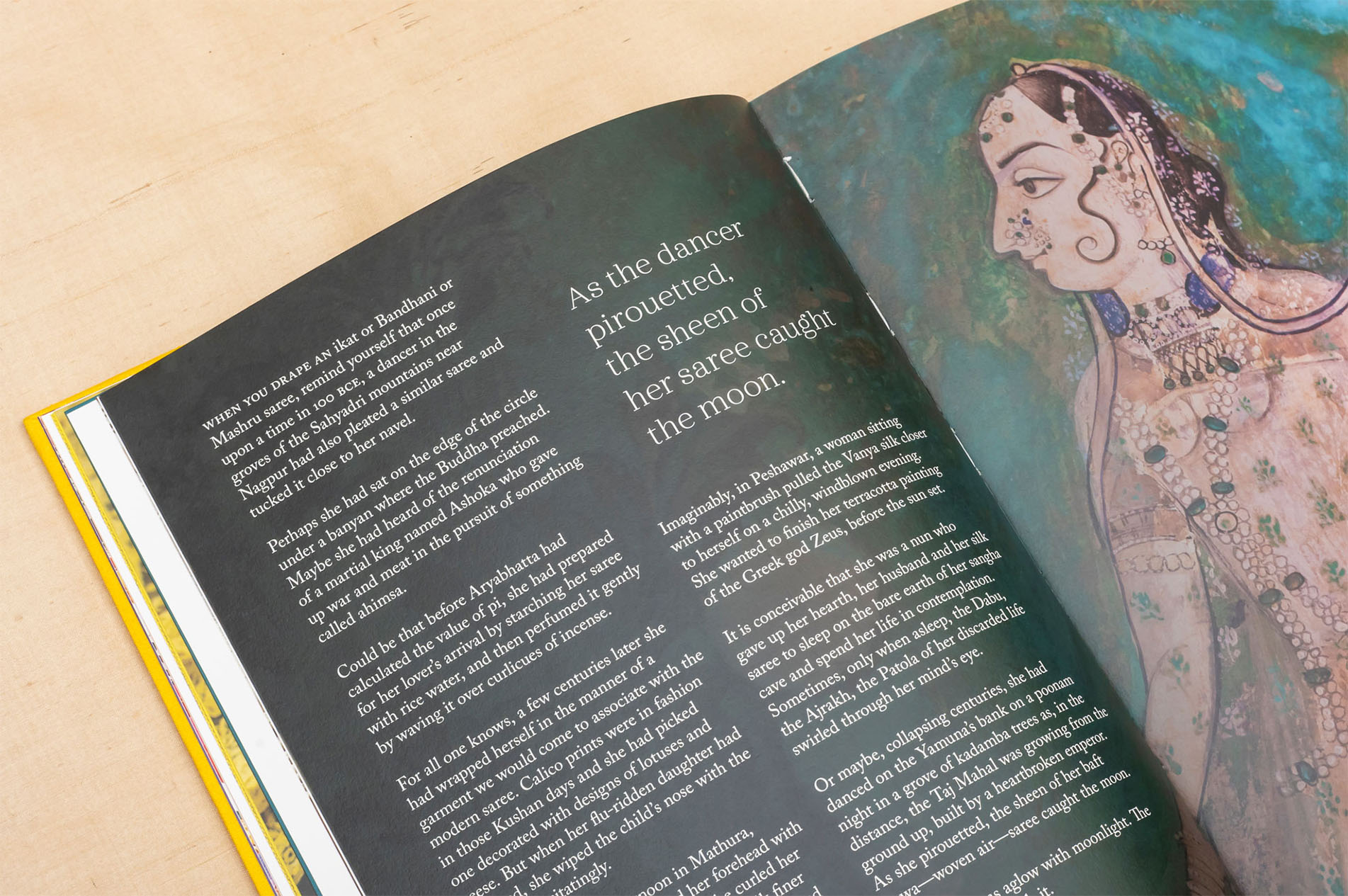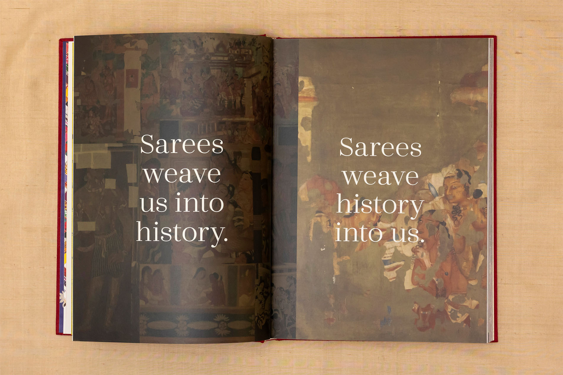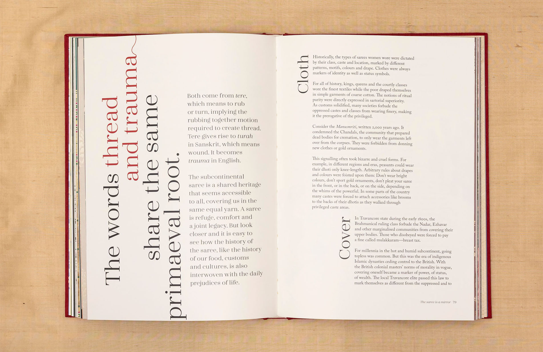 Over seven thousand years old and enmeshed with South Asia’s cultural history, the saree clothes at least half a billion people. The saree is iconic but also pervasive with thousands of books, films, talks, papers, reels and exhibitions about it. So we dove into the hundreds of pages of saree interviews to come up with a creative concept that would bring order and give shape to the book. Then we set down to researching, writing and designing the book.