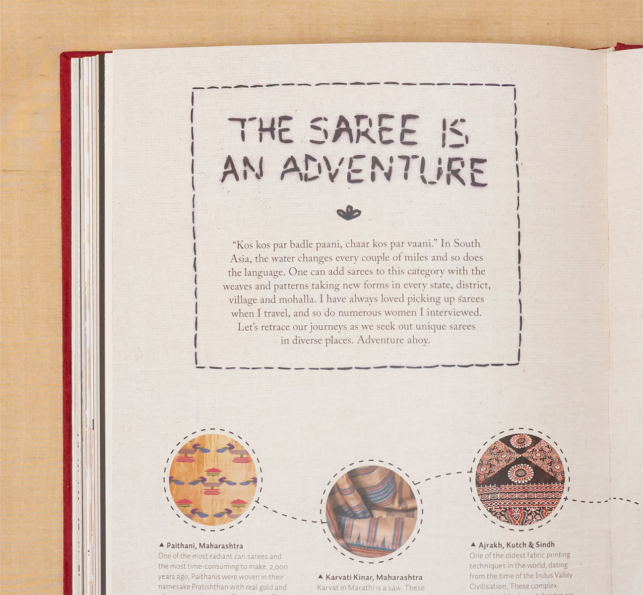 We treated each chapter like its own creative universe to evoke the innumerable meanings a saree holds to its wearers. To replicate the unforgettable tactile nature of the saree, we made real things with our hands—we stamped and sewed and embroidered and painted and wove.