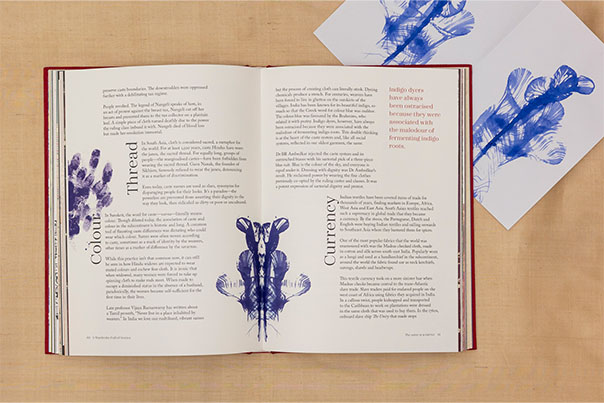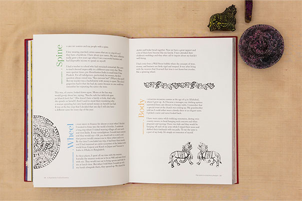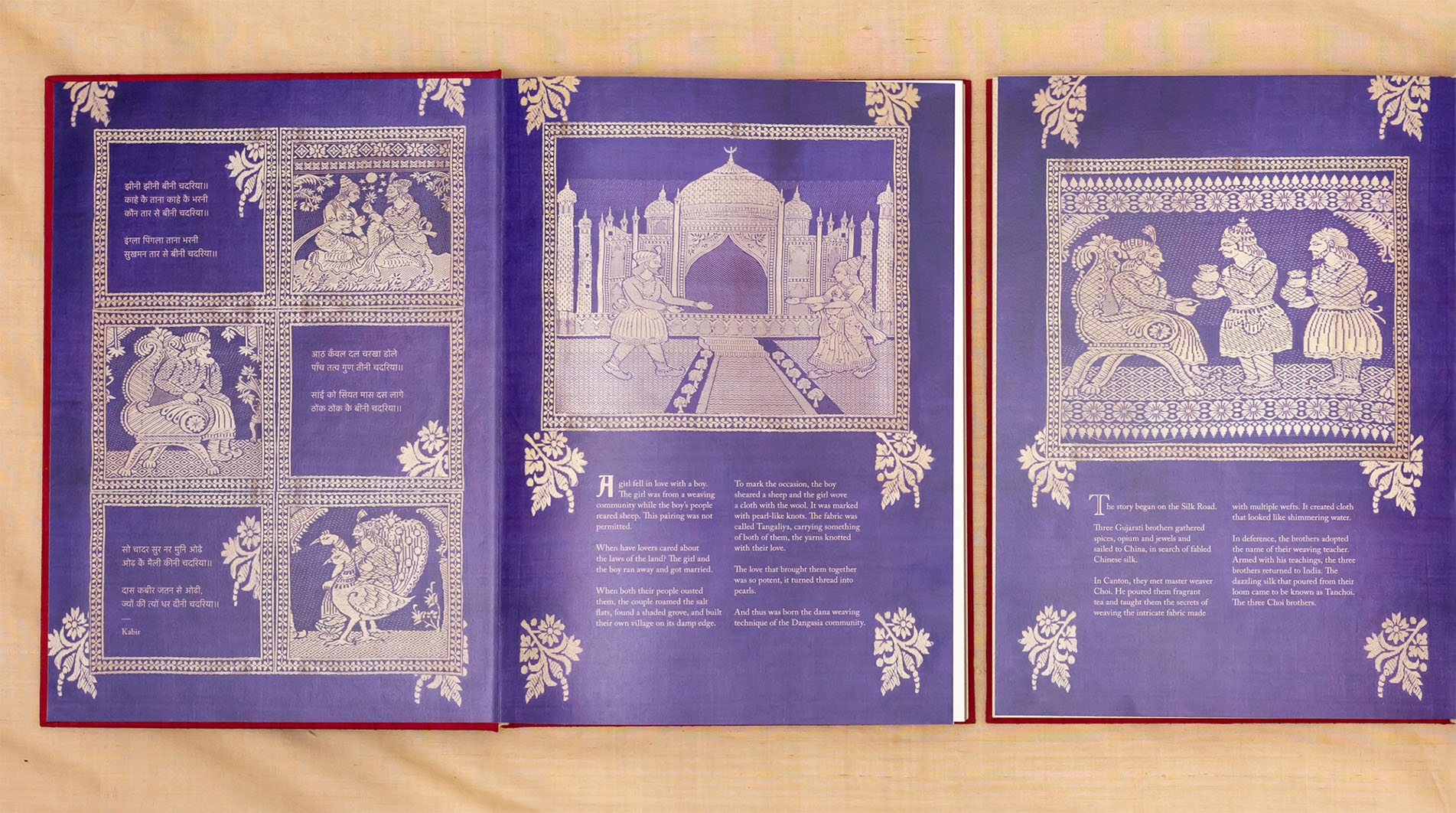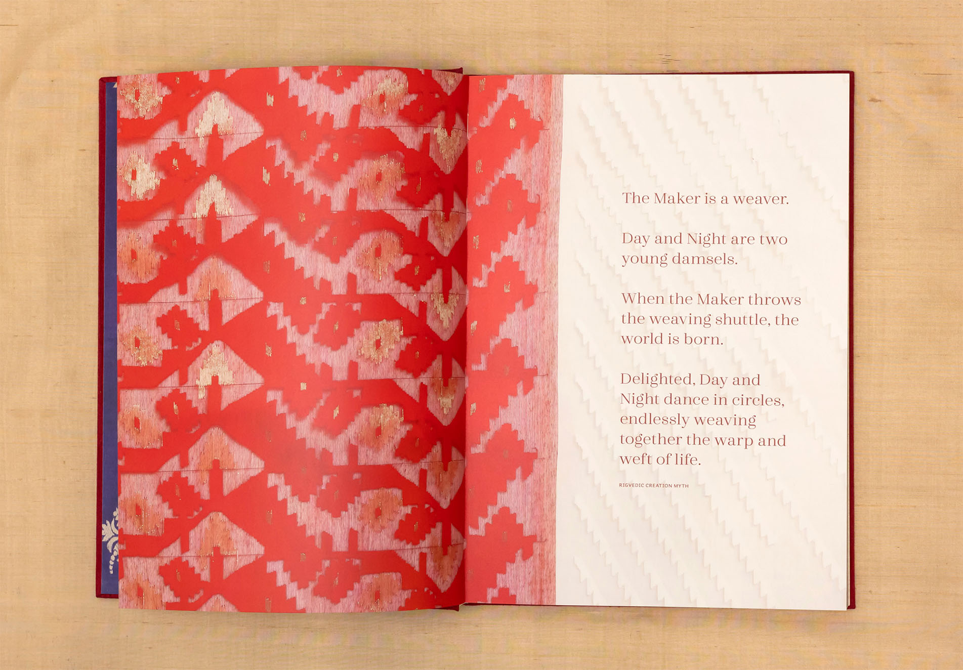 We embroidered maps on cloth; recreated a 5,000-year-old pattern with a hand-carved potato stamp; made our own kaleidoscope to photograph a Paithani’s infinite reflections; wove voices—literally—into a tapestry with strips of paper; and turned saree motifs into word poetry. Finally we cloaked the book cover in raw silk with gold foil motifs.
