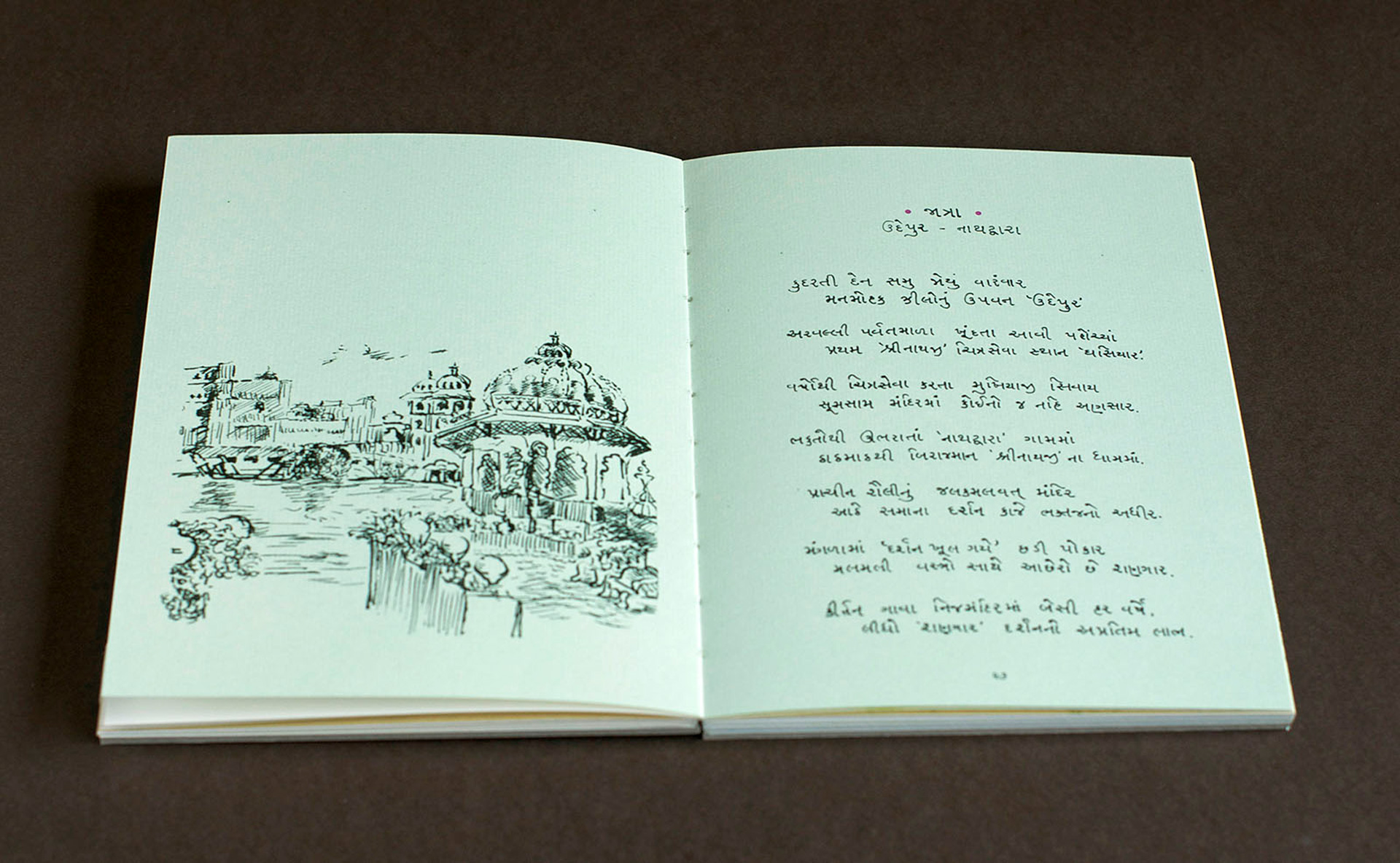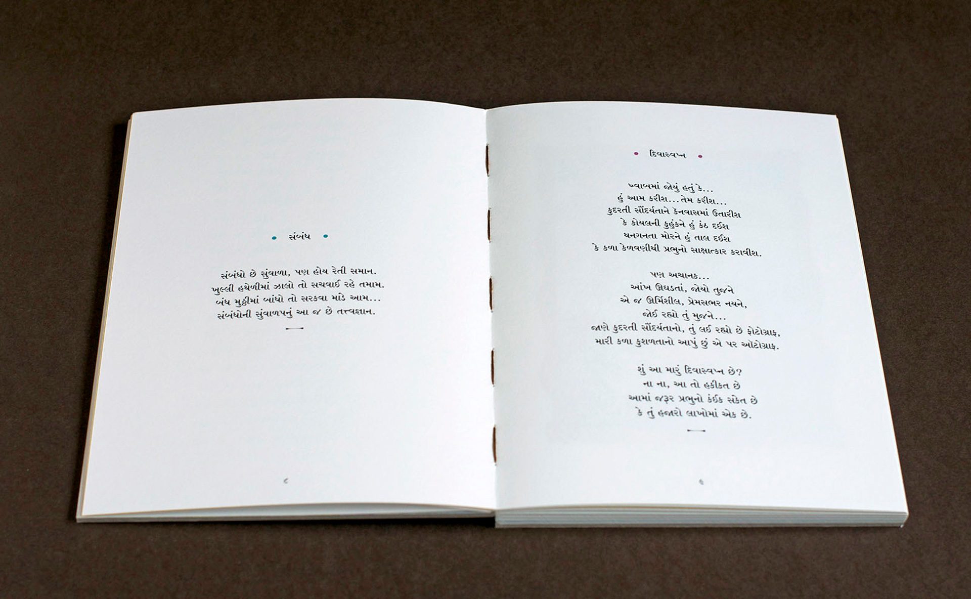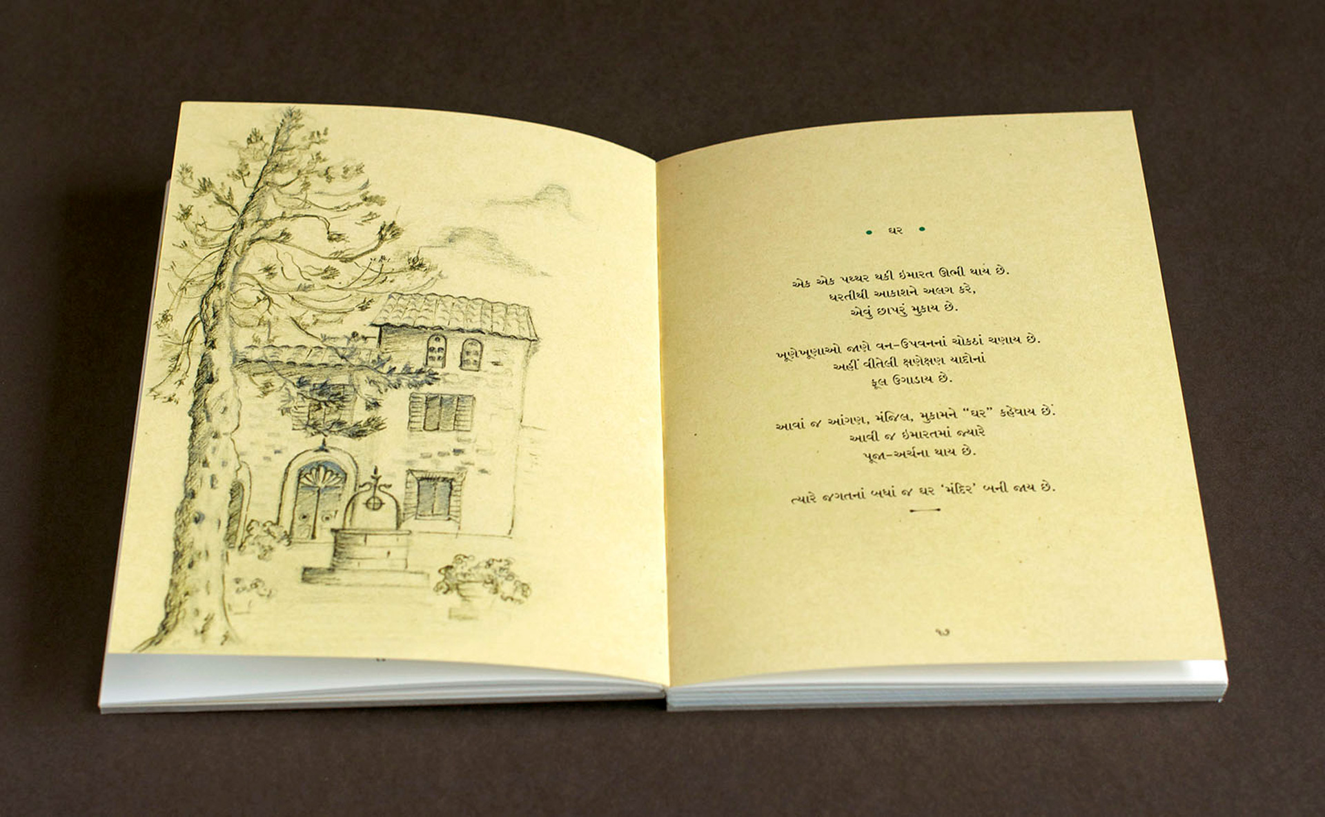 The anthology paralleled the artist’s multiplicity by doing away with a singular title. The first poem begins on the cover itself, with the word inscribed on it, Gujarati for “I.”