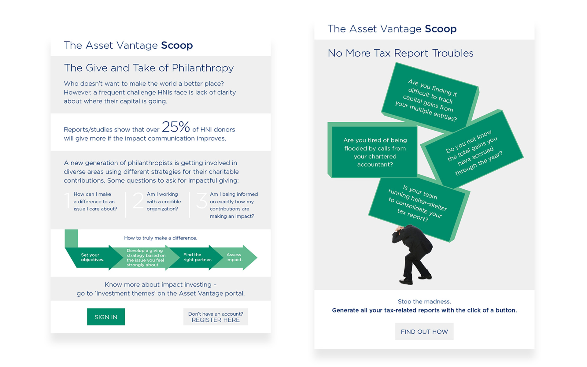As a way to foster audience trust and increase engagement with the brand, the content strategy comprised a series of financial literacy email newsletter called SCOOP. We used simple language and delightful infographics to explain financial best practices and give novel wealth planning insights.