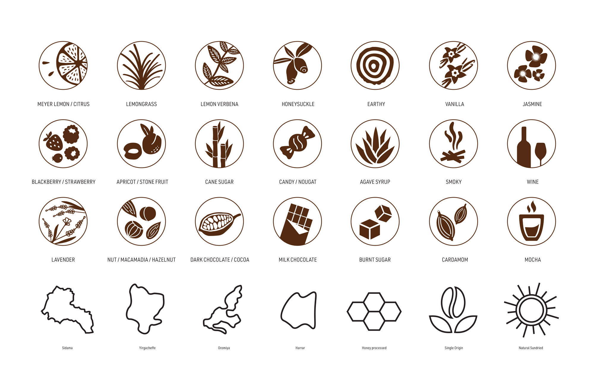 For the website we created a system of icons for coffee tasting notes, coffee varietal processes and origin maps. Coffee and culture are inextricable. We used these icons to tell the story of the coffee beans—their past, present and future—from seed to cup.