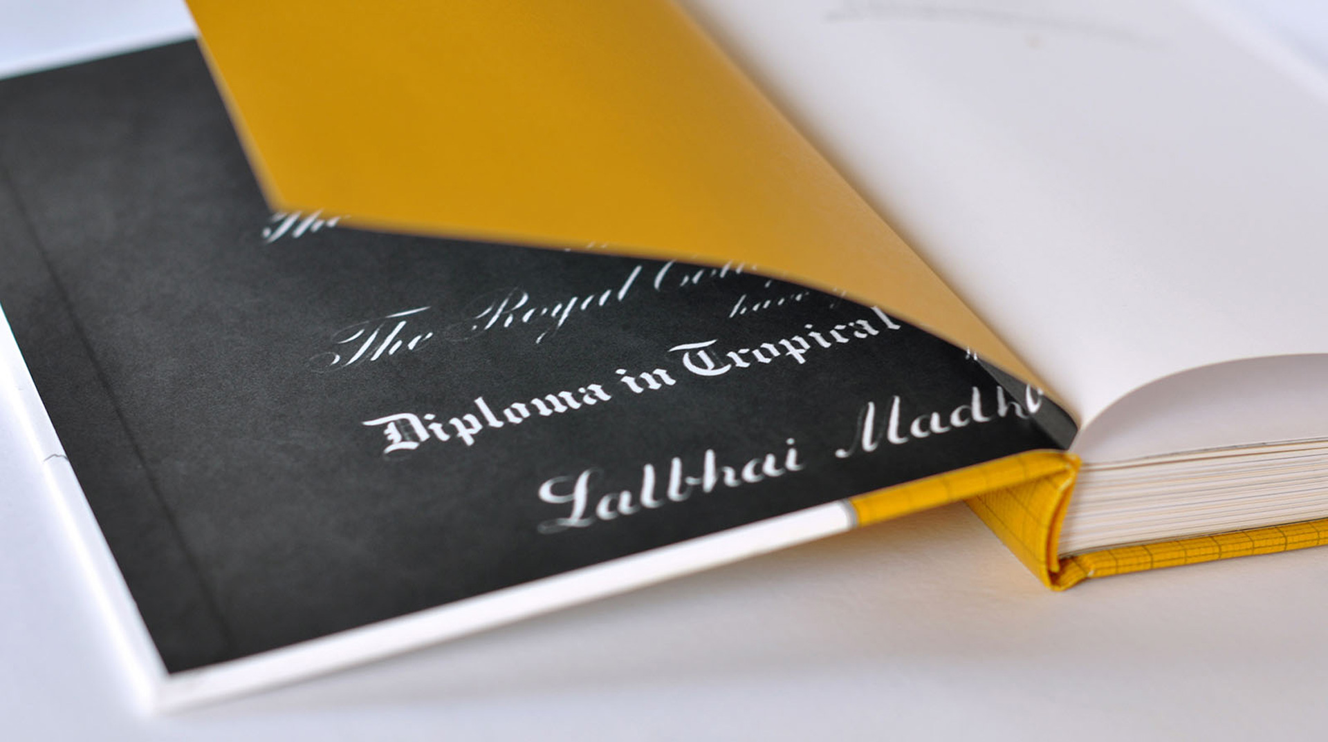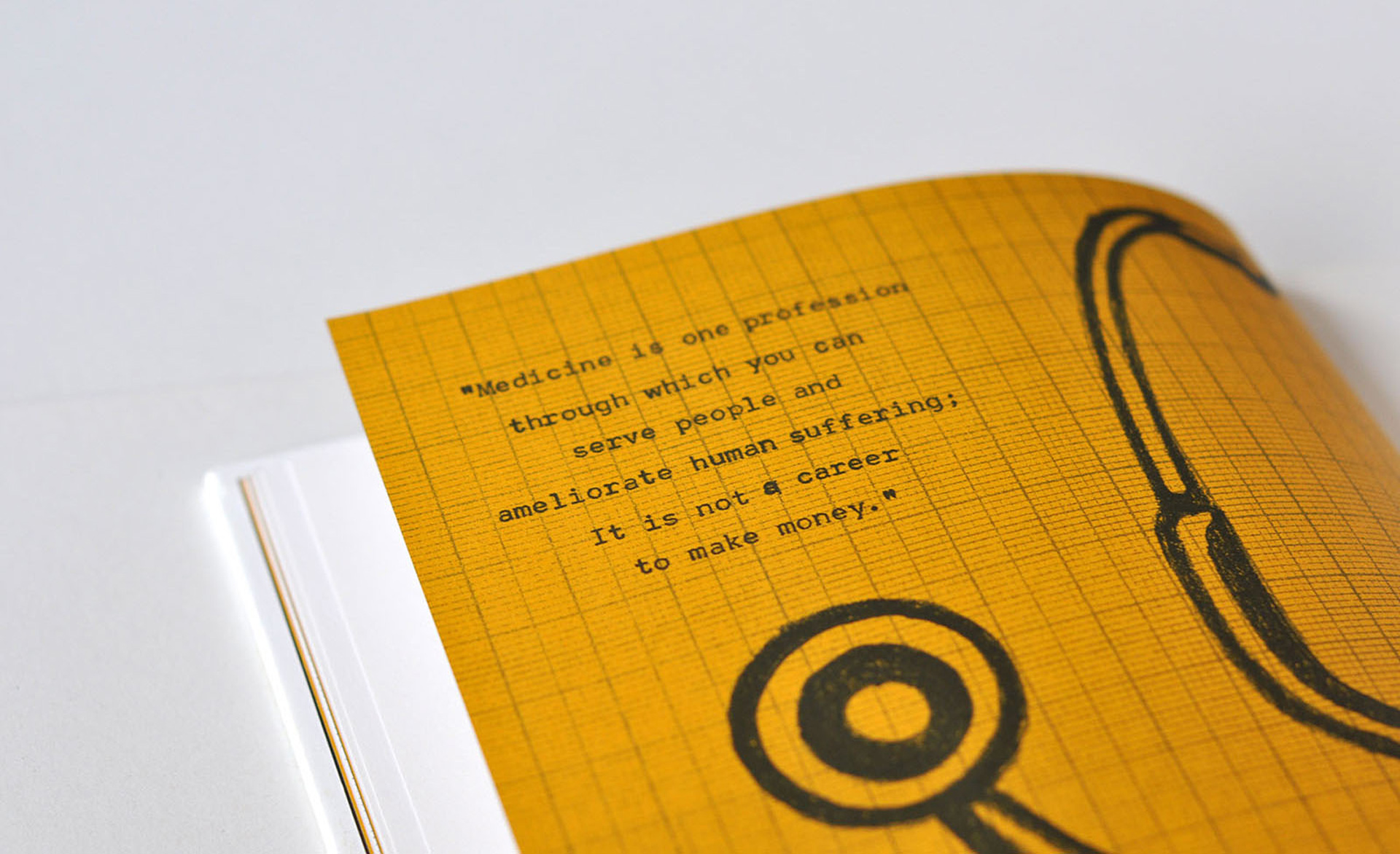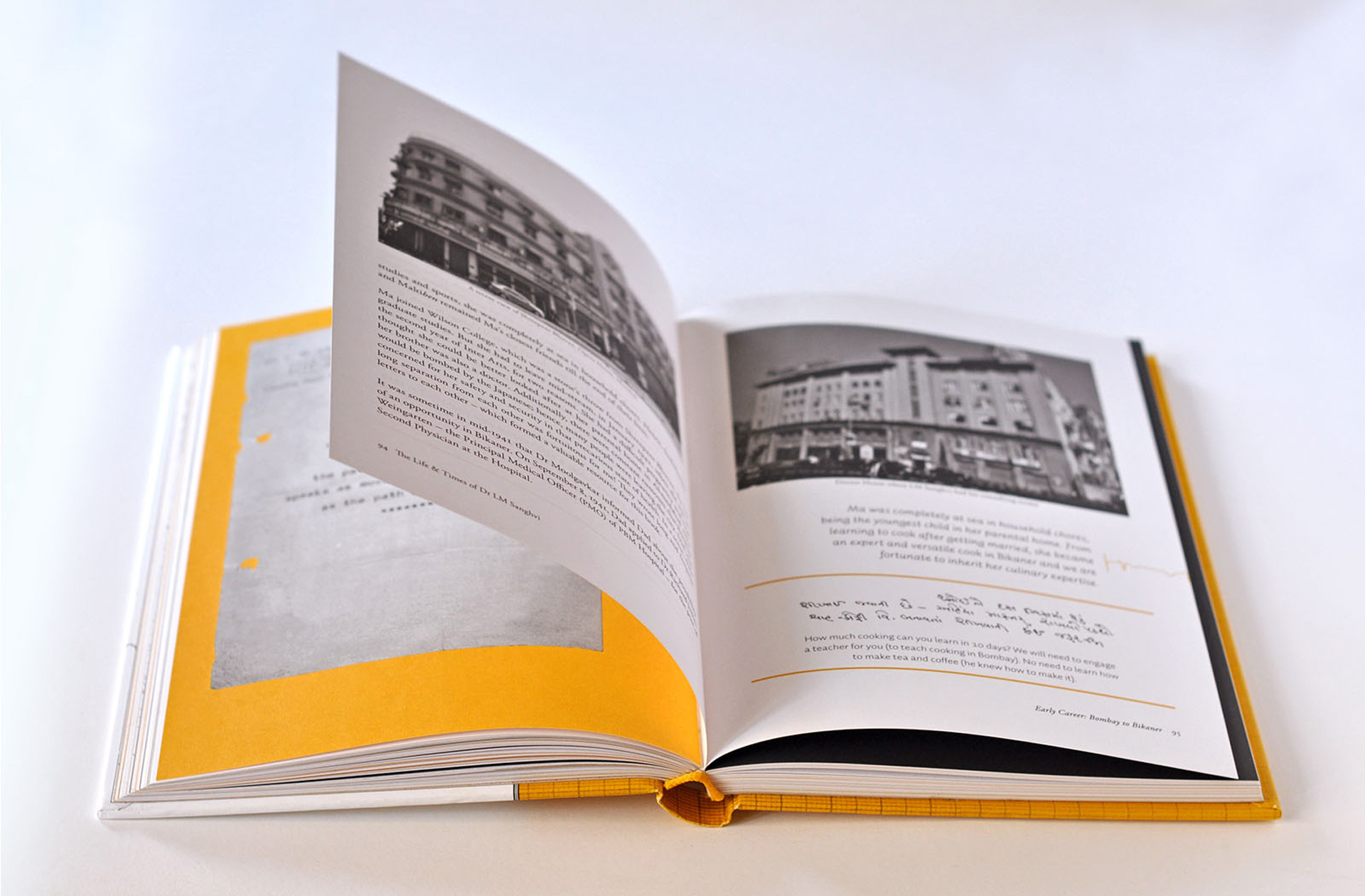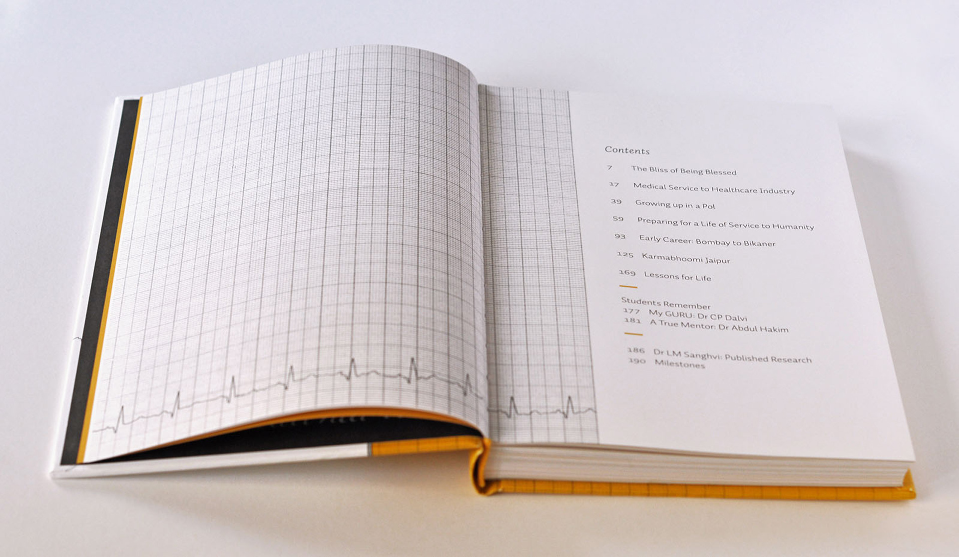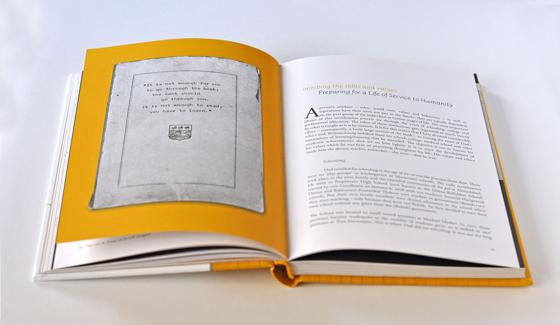 By printing the book in two colours, the design embodies the simple and profound life of Dr. LM Sanghvi. Each chapter opener had one lesson from Dr. Sanghvi’s life, printed the old-fashioned way, with a typewriter. We used numerous archival documents such as old medals, letters, postcards, vintage glass-edged certificates as design elements throughout the book.